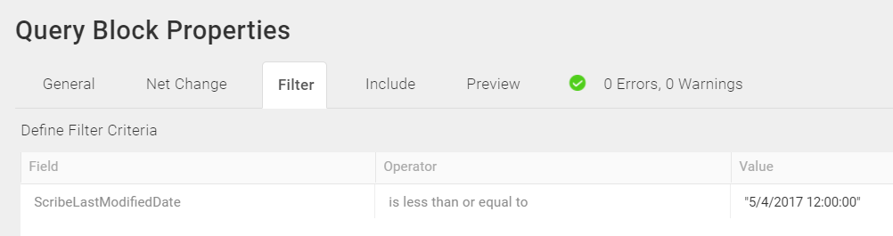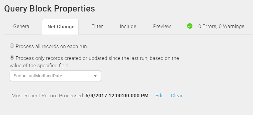- Net Change —Filtering for new or updated records using the options on the Query Block Net Change tab is not supported for this entity.